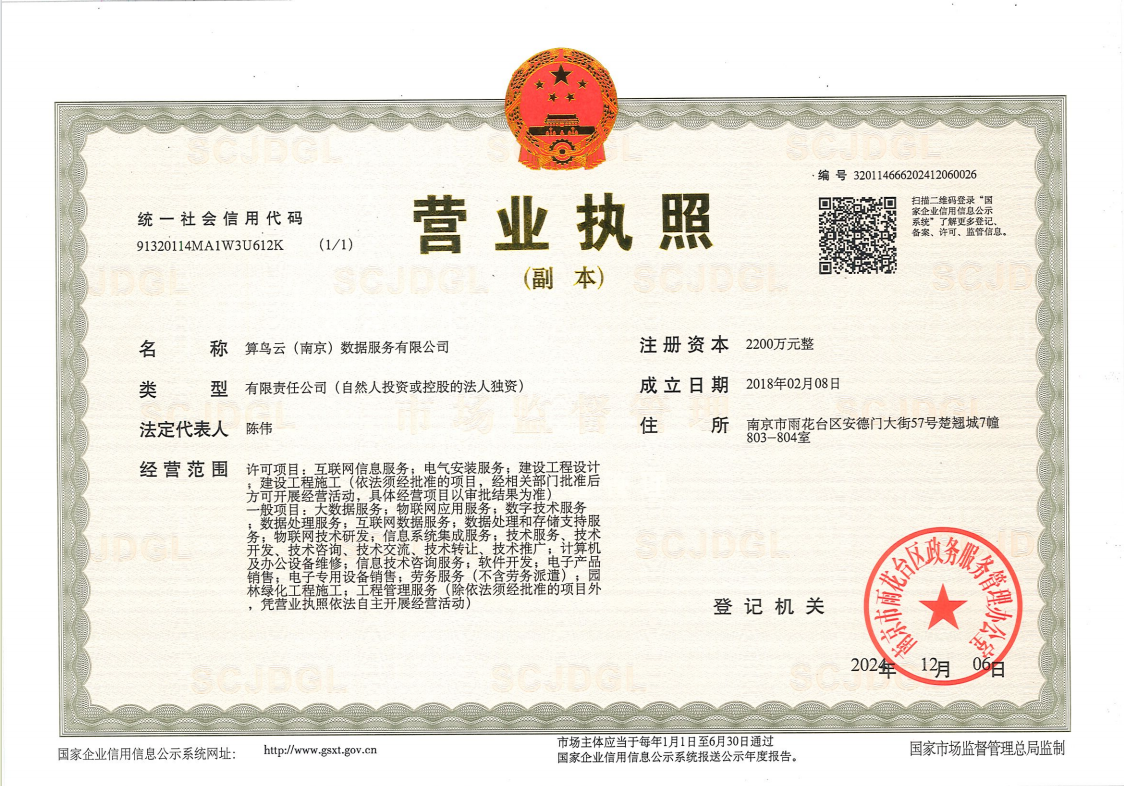 新立訊科技集團全資子公司 “南京新立訊物聯網技術服務有限公司”經國家市場監督管理總局核準,南京市市場監督管局登記備案,正式更名為“算鳥云(南京)數據服務有限公司”。