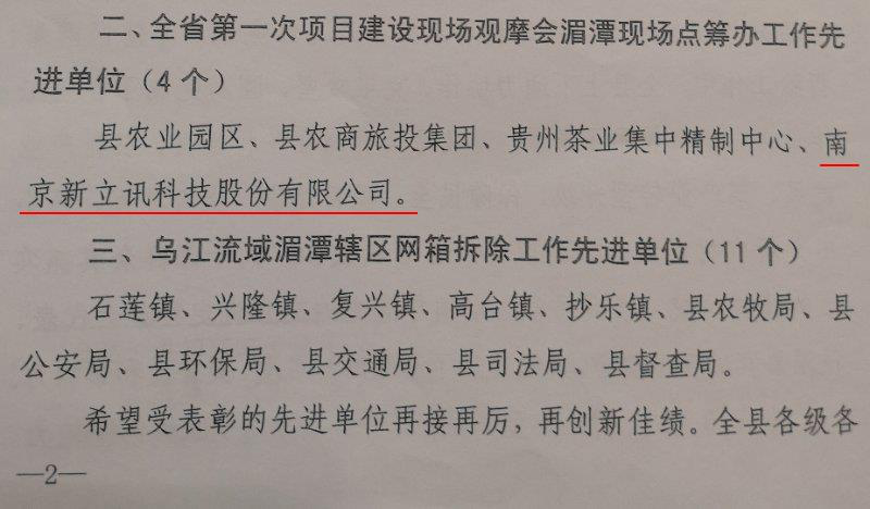 2018年5月16日,貴州省湄潭縣委、縣人民政府對(duì)南京新立訊科技股份有限公司在2018貴州茶“一節(jié)一會(huì)”籌備、貴州省全省第一次扶貧項(xiàng)目建設(shè)現(xiàn)場(chǎng)觀摩會(huì)湄潭現(xiàn)場(chǎng)點(diǎn)籌辦等工作中的優(yōu)秀表現(xiàn)及突出貢獻(xiàn)進(jìn)行通報(bào)表揚(yáng)。
