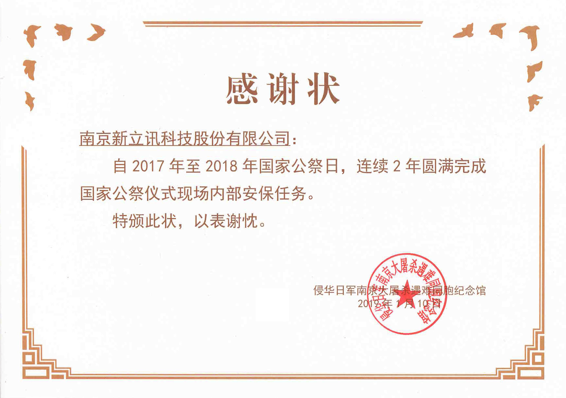新立訊收到侵華日軍南京大屠殺遇難同胞紀(jì)念館感謝狀